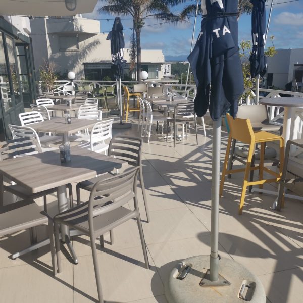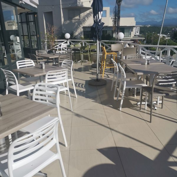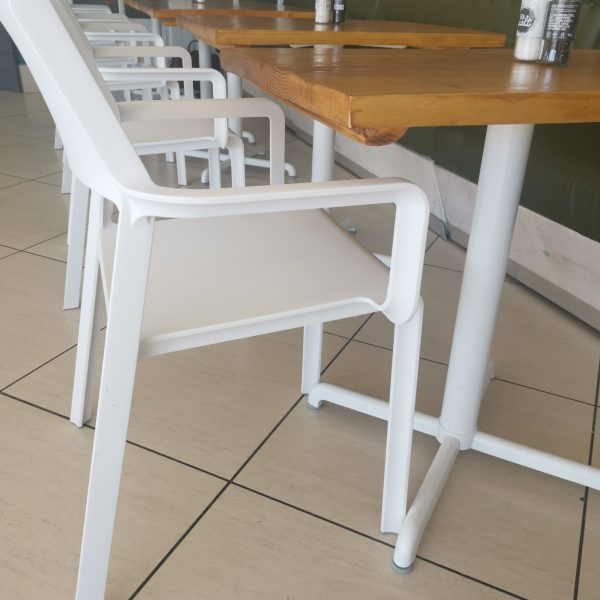 This is the Nardi Range, the Costa Side chair in White and Taupe, the Trill Armchair in White, the Trill Side chair in Aqua Blue and the Trill h75 Barstool in Mustard and Tuape and the Calice Alu std Base and Bar base in white.