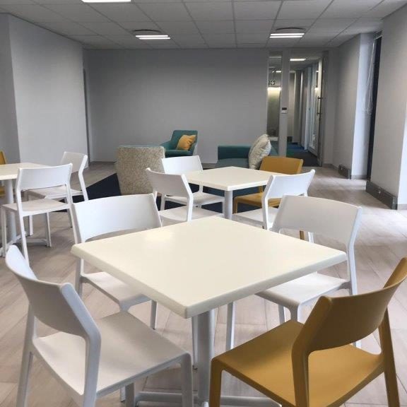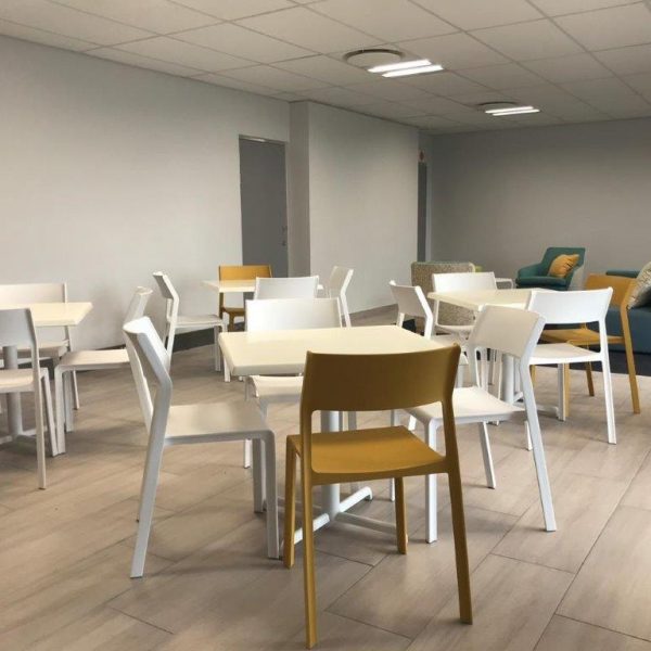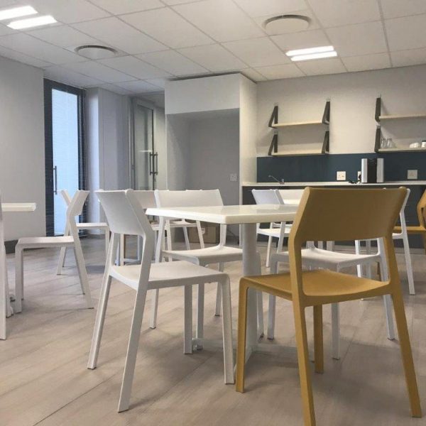 | White and Mustard Trill Chairs and White Calice Alu Bases. |