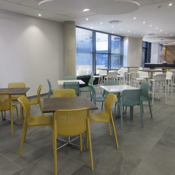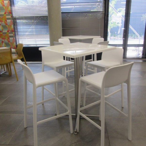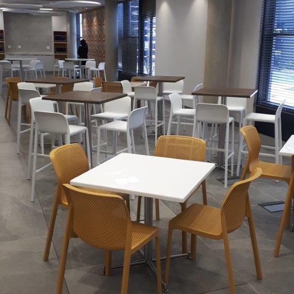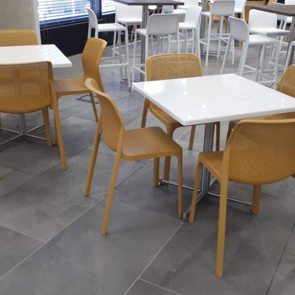 | Bit Side Chair in Mustard and Sea Green with the White Faro H75 Barstool. |