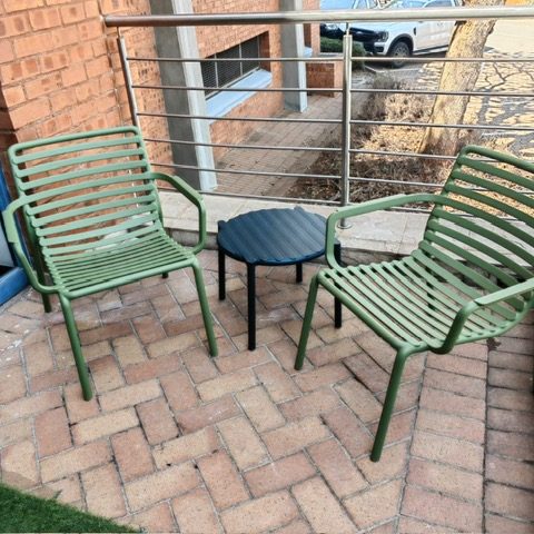 Introducing the Clip 80 Table in Anthracite Grey, paired with the Doga Side in Anthracite Grey and complemented by Trill side chairs in Taupe. On the balcony, enjoy the Doga Relax armchair in Khaki Green, paired beautifully with the Doga Table in Anthracite Grey. This stylish combination adds a modern touch to your outdoor space while ensuring maximum comfort. Elevate your patio experience with this stunning blend of design and relaxation!