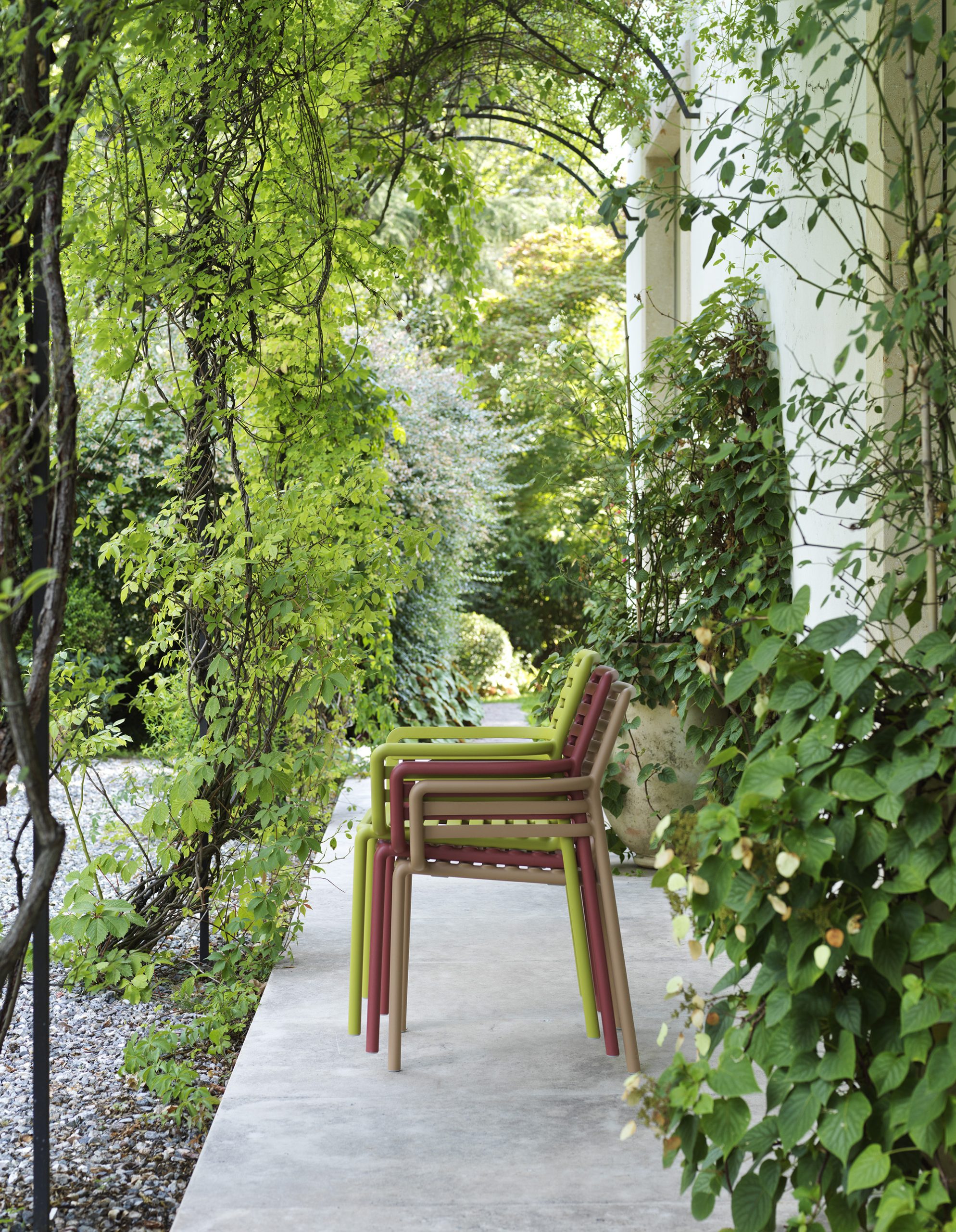 Doga Armchair is for outdoor use and made of fiberglass resin. It is inspired by a slatted design given a contemporary twist by the designer Raffaello Galiotto. It is handy to move, stackable, easily sanitized and entirely recyclable, uniformly colored fiberglass polypropylene resins with UV additives.