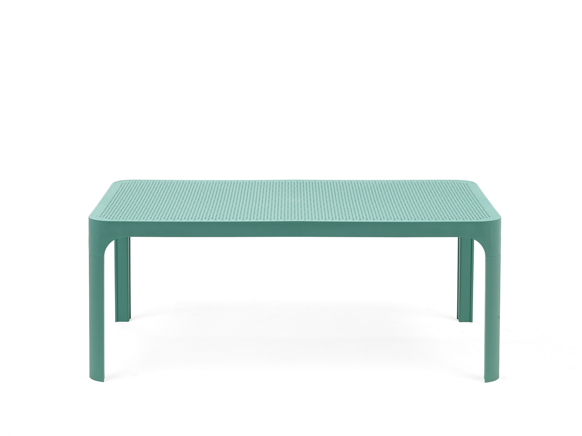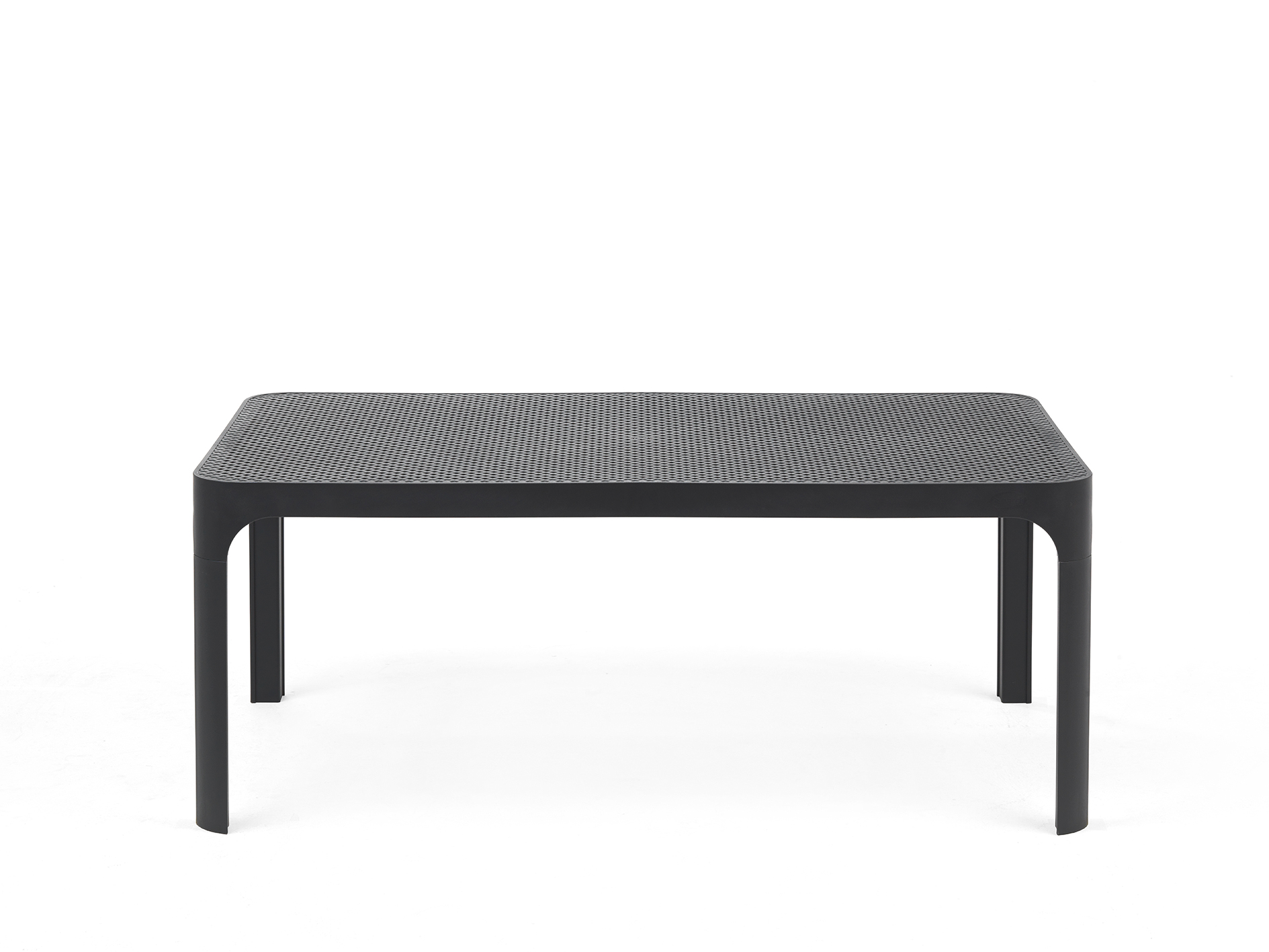 Side table 100×60 cm tabletop. Made of uniformly colored fiberglass polypropylene resins with UV additives. May be dismounted and has non-slip feet.